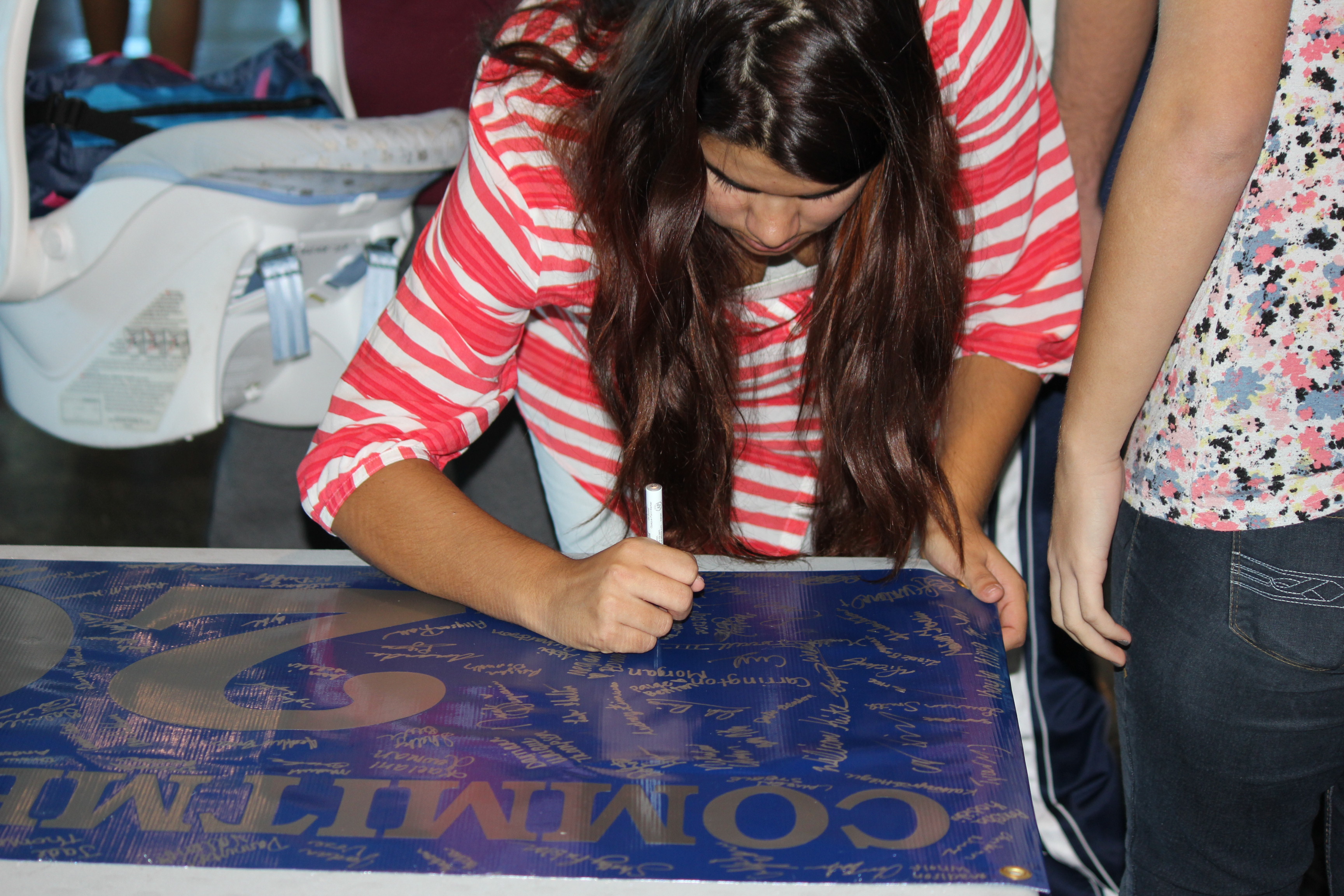 Junior Justice German-Martinez along with the rest of the class signs their banner committing to excellence. Class rings were then passed out along with time to enjoy donuts. Photo by Maddy Arsenault.